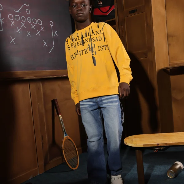 أضف لمسة عصرية إلى إطلالته مع كنزة الأولاد الصيفية القطنية ذات الرقبة المستديرة والمزينة برسومات مميزة. تتميز هذه الكنزة الفنية بطبعة كتابية كثيفة على الصدر والكتفين، مع تفاصيل رسومية عمودية فريدة. مصنوعة من قطن صيفي يسمح بمرور الهواء ليمنحك شعورًا بالانتعاش طوال اليوم.