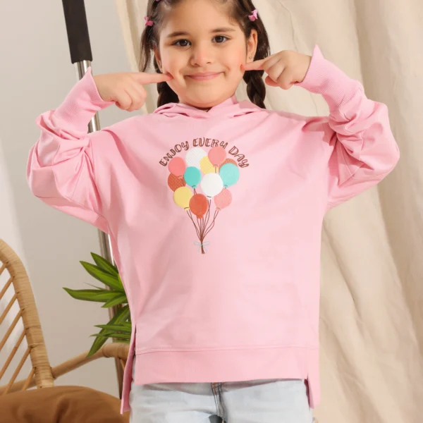 انشري السعادة أينما ذهبتِ مع سترة القطن الصيفية للبنات الصغيرات. هذا البلوزة المرحة تتميز بمجموعة من البالونات الاحتفالية والرسالة الإيجابية "استمتع بكل يوم"، وكلها مصنوعة من قطن الصيف الفائق النعومة والقابل للتنفس.