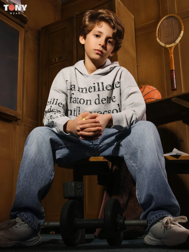 سبورت برو (كريمي): يبدو البلوزة البيضاء الباهتة نظيفة وواضحة. نسقه مع الجينز والإكسسوارات الرياضية (مثل مضرب التنس في الصورة). إنه مثالي للصبي الذي دائمًا في حركة.